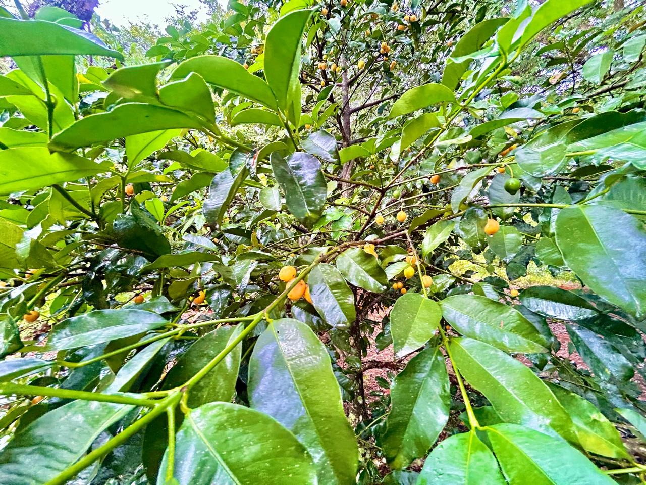 Com várias árvores frutíferas produzindo.