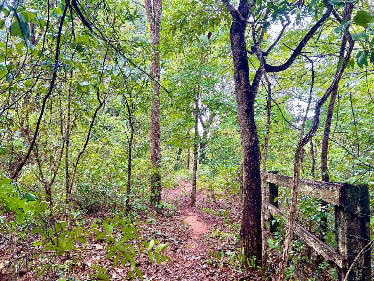 Trilha e muitas árvores nativas.