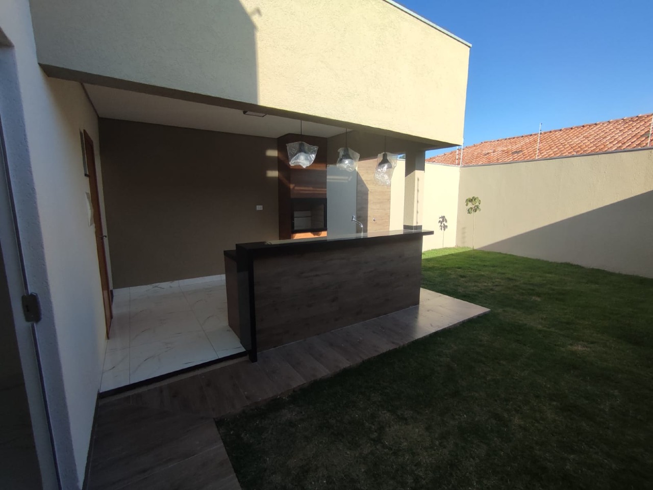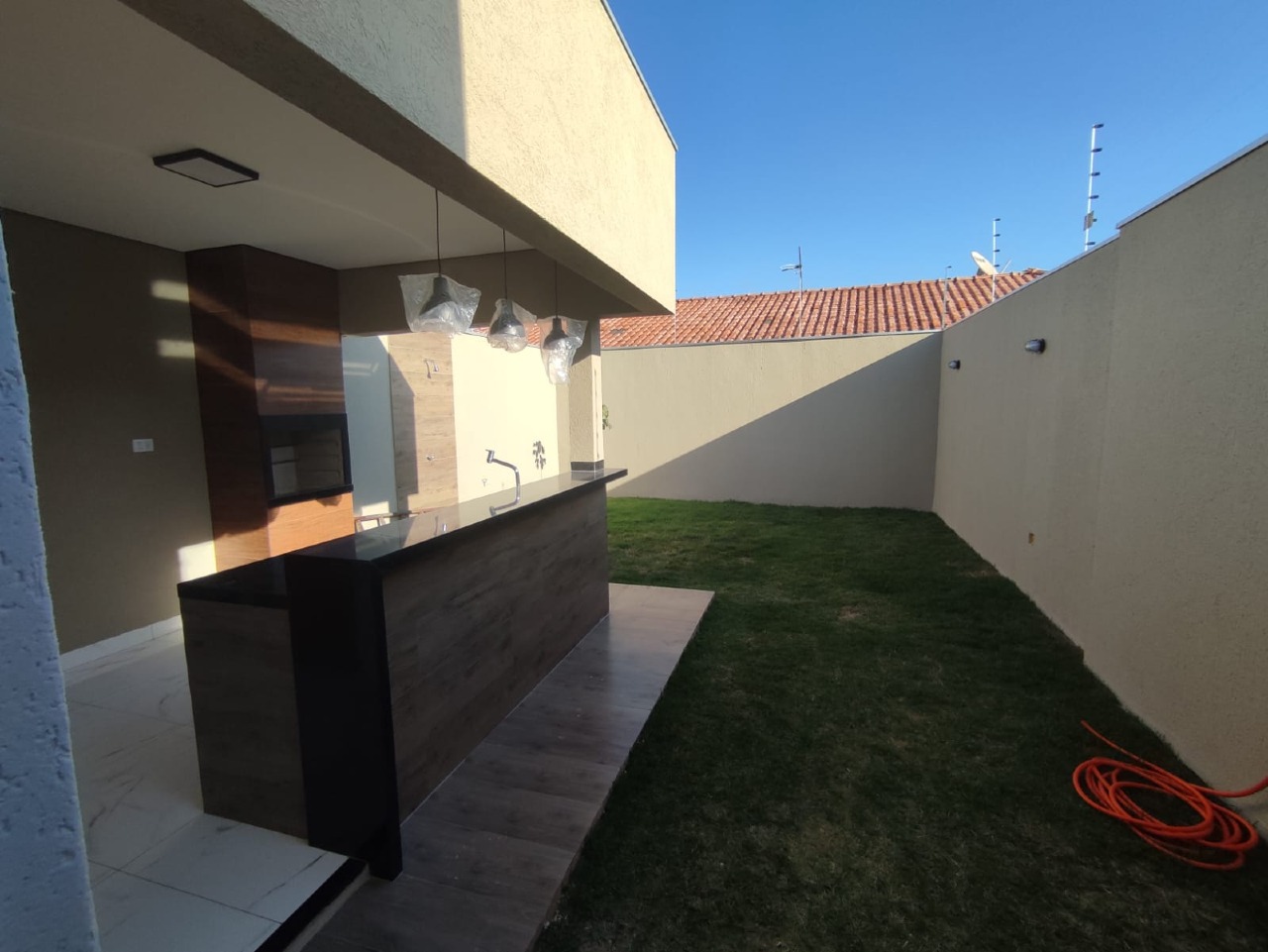 A casa possui três quartos, sendo que dois deles são suítes, proporcionando privacidade e conforto aos moradores. A área de serviço também é coberta, facilitando as tarefas do dia a dia.