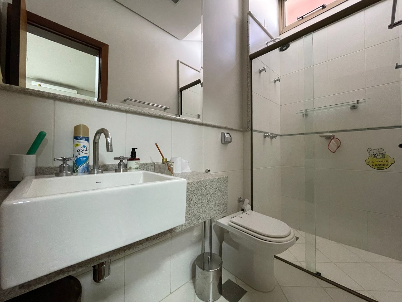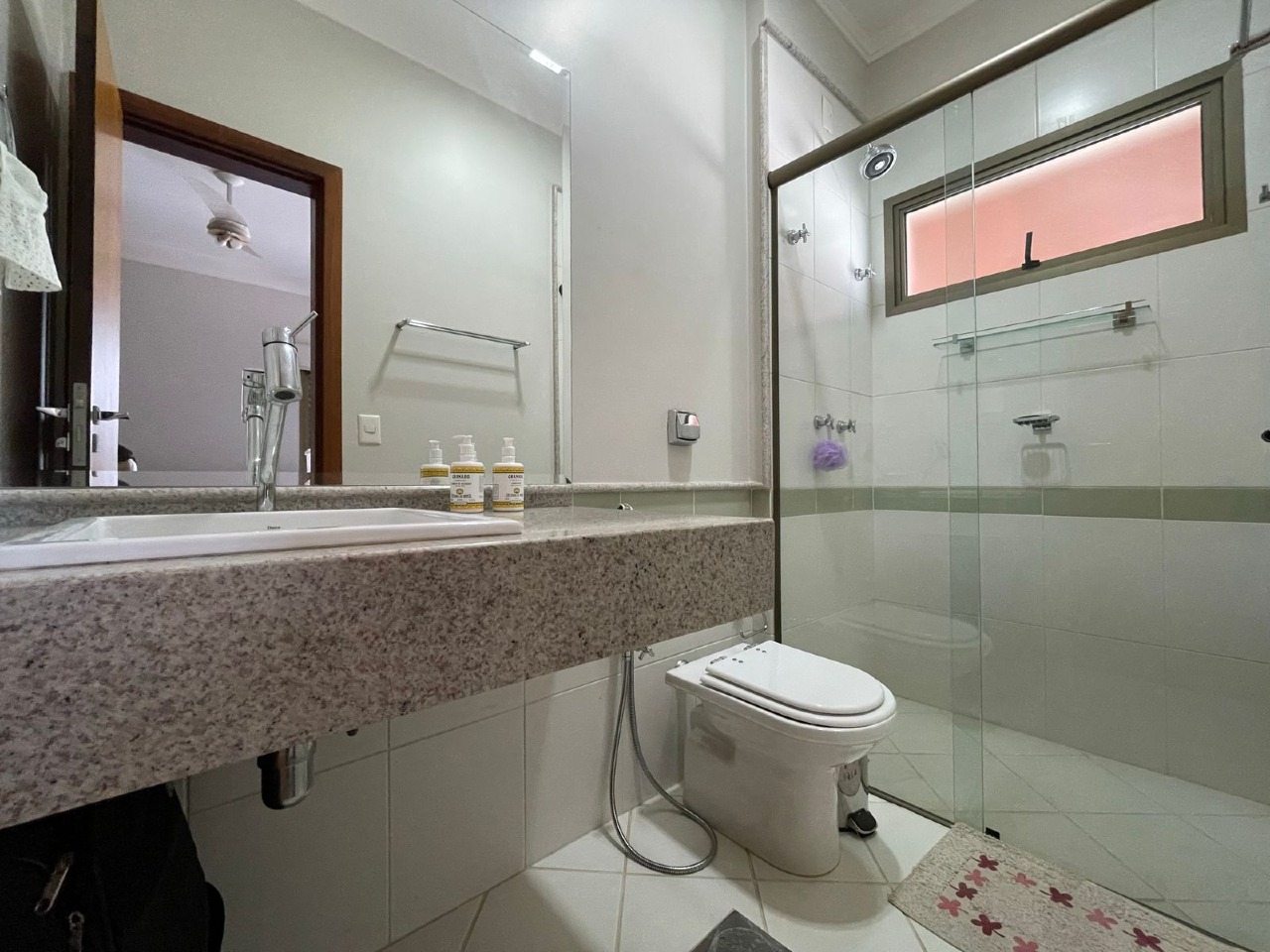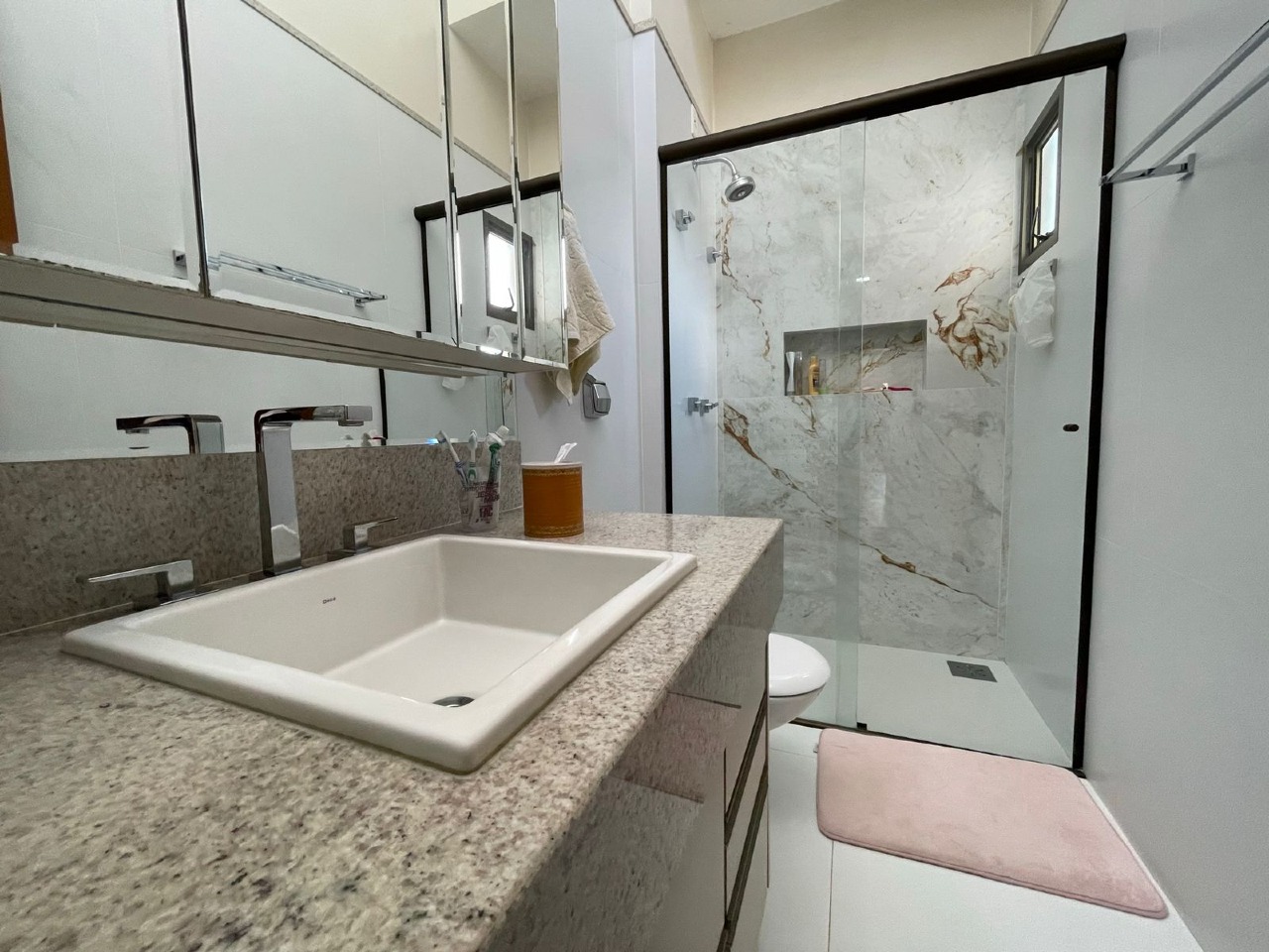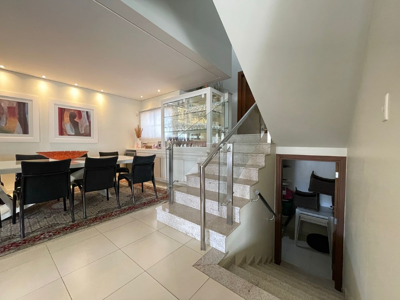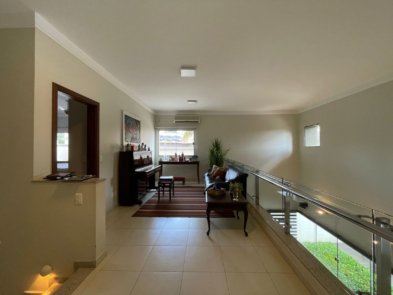 Piso superior: Sala de estar, suíte ampla com sacada, suíte master com closet, banheiro com hidromassagem e sacada ampla fechada com vidro, dois quartos e banheiro social.